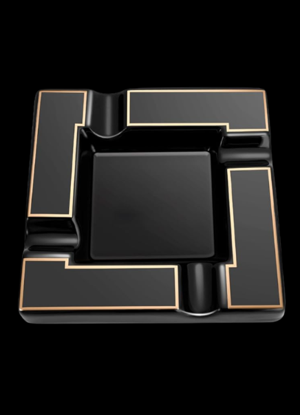 Elevate your experience with this premium ceramic ashtray. Designed in a sleek black finish with elegant gold accents, it combines sophistication and durability. Perfectly sized at 6"L x 6"W x 3"H, it offers four cigar rests and a deep center tray, making it both functional and stylish. Crafted from high-quality ceramic, this ashtray is an essential accessory for every cigar aficionado.